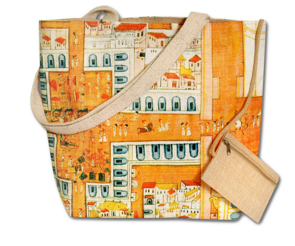Cotton canvas tote, open top with single snap closing, woven cotton handles. Small inner purse. Inspired by images from a Garden & Cosmos painting depicting havelis, pavilions and houses in the temple town of Mahamandir. Size 16" (40.6 cm) wide at top, 14" (35.6 cm) deep.