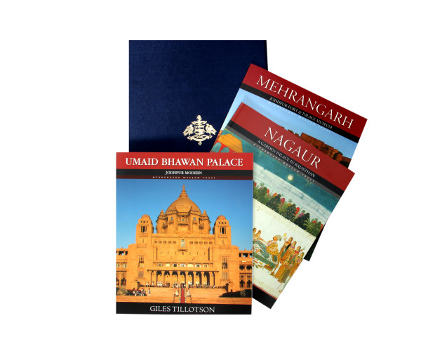 Three books by renowned scholar Giles Tillotson, on Mehrangarh Fort, Umaid Bhawan Palace, and the garden palace of Ahhichatragarh Fort in Nagaur. Packaged together in blue silk presentation case with Royal Jodhpur crest.