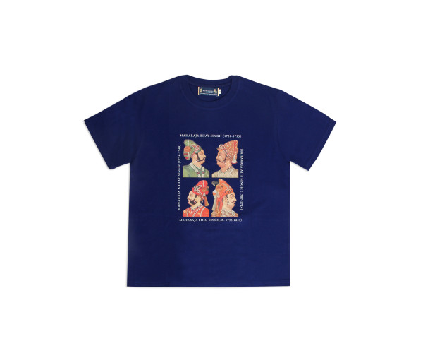 Four Kings t-shirt for men, with images from paintings of early Jodhpur Maharajas. Pure cotton, classic fit, machine washable. Navy Blue. Sizes sm, med, lg, xl.