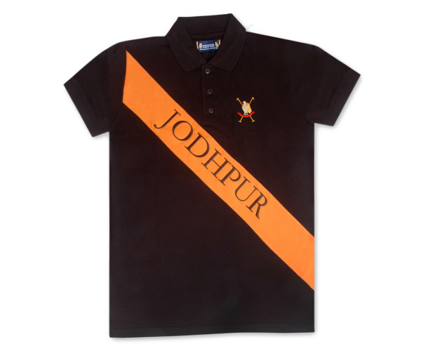 Authentic Jodhpur Polo Team Shirt, black pique with orange Jodhpur banner inset. Cotton blend, machine washable. Sizes sm, med, lg, xl, xxl.