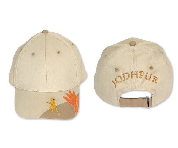Cotton cap for small heads (adjustable loop in back). Coordinates with Kishkinda Forest T-shirt. Pure cotton with embroidered monkey and "Jodhpur".One size.