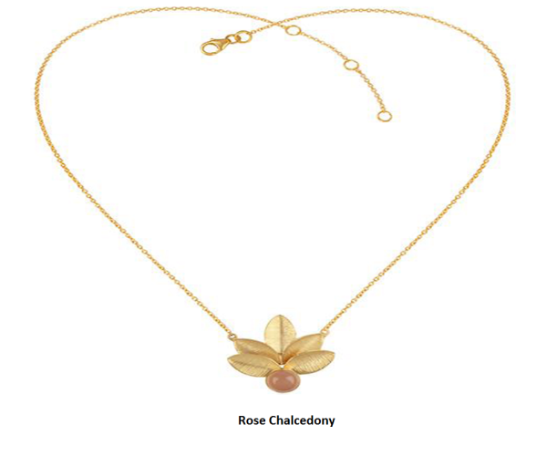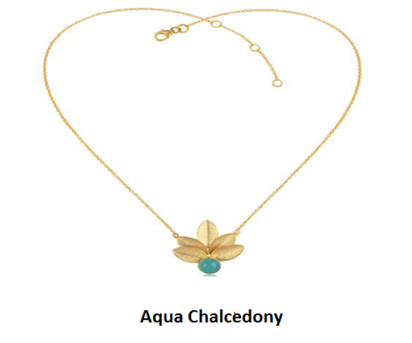 Pendant with chain, gold plating on brass, five leaves with semi-precious stones. Aqua chalcedony or rose chalcedony.