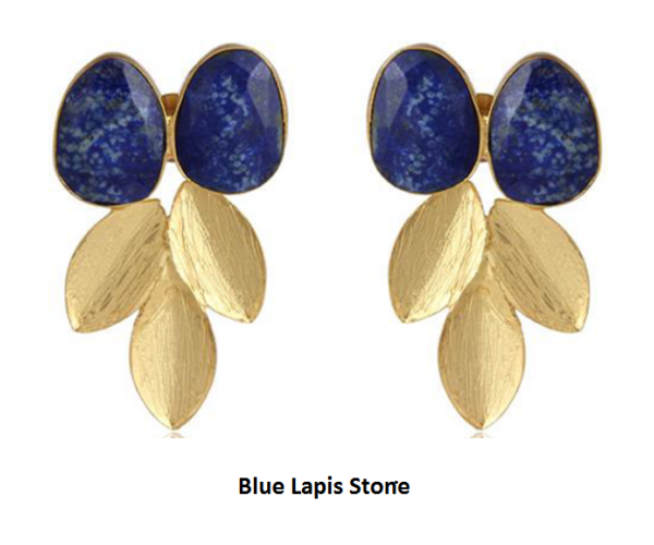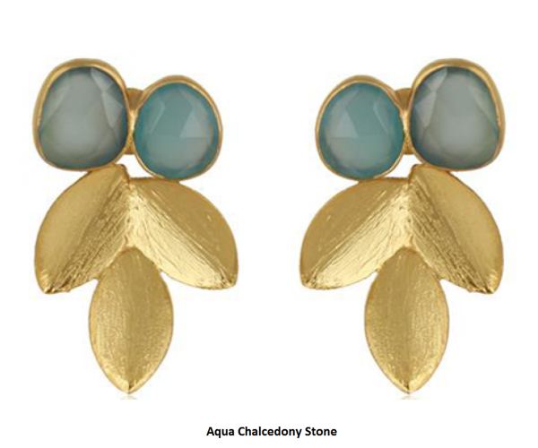 Earrings, gold plating on brass, three leaves with semi-precious stones.
