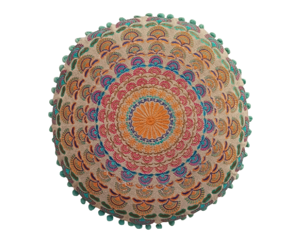 The seven chakras are centres of energy within the body.The symbols that represent them are finelyembroidered in multi colors on this pure cotton round cushion cover, and metaphysically symbolize thecosmos.They will bring gentle beauty into your home. Size (diameter) 16 inches (40.6 cms)
