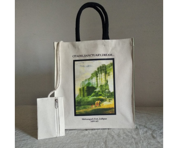 Cotton canvas open tote, with woven cotton handles and small inner purse.The romantic image of Mehrangarh Fort, as it appears in a 19th century painting by the artist Deware. Size 14.75" (37.5 cm) height; 12.5" (31.8 cm) wide.