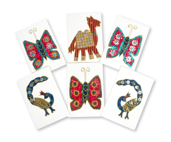 Set of 6 notecards, with envelopes. Mixed designs, applique fabric on white handmade paper. Created by the children of Umang.
